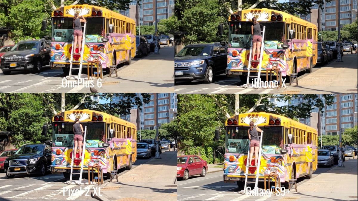 Luego, tomamos una foto de una mujer pintando su autobús escolar. Las imágenes son muy similares, pero cuando hacemos zoom podemos decir que el Pixel 2 XL y el iPhone X tienen el mejor rango dinámico. El Galaxy S9+ y el OnePlus 6 son demasiado similares como para notar la diferencia.