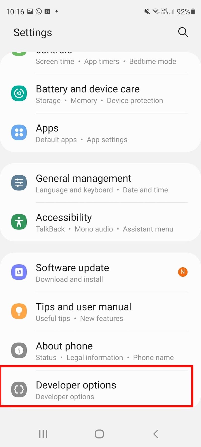 Paso 5: Vuelve al panel Configuración, donde ahora encontrarás Opciones de desarrollador como una entrada.
