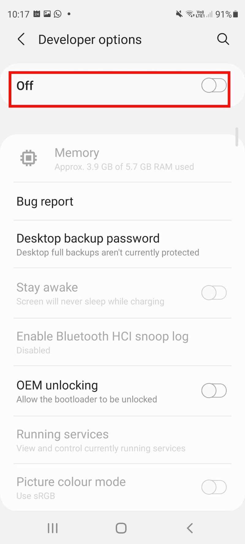 Es fácil desactivar las opciones de desarrollador directamente desde tu menú de Configuraciones si ya no necesitas tener acceso a ellas. El primer paso es dirigirte a Configuraciones, hacer clic en Opciones de Desarrollador, y seleccionar Apagar.