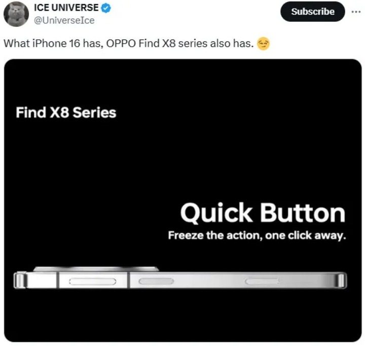 El filtrador Ice Universe afirmó en X que la serie OPPO Find X8 copiará la gama iPhone 16 adoptando el llamado «Botón Rápido». Una imagen compartida por el informante incluye la frase «congela la acción, a un clic de distancia».