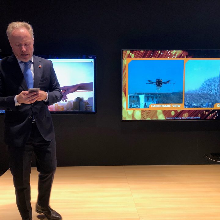 En este caso, utilizaron un dron que se encontraba justo afuera de las inmediaciones del Centro de Convenciones FIRA, el recinto que alberga el MWC. Fueron capaces de hacer volar el dron de arriba a bajo, y de rotar su cámara para lograr obtener una mejor visualización del panorama. Esto podíamos verlo a través de dos cámaras que nos mostraban imágenes en vivo, una que apuntaba hacia el dron y la otra era la cámara del dron mismo, que nos mostraba el panorama. La calidad de la imagen de la cámara del dron era de alta definición y sin ningún tipo de buffering.