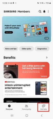 Paso 1: abre la aplicación Samsung Members y haz clic en Obtener ayuda en la parte inferior de la pantalla.