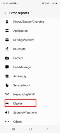 Paso 2: desplázate hacia abajo hasta Enviar comentarios y haz clic en Informes de errores. Luego selecciona el tipo de error, en este caso, Pantalla.