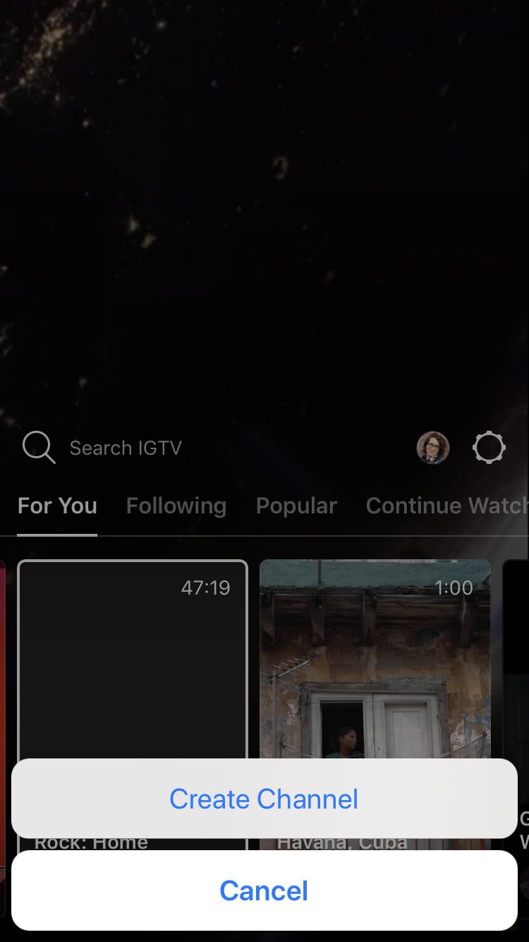 Si bien la experiencia de visualización puede ser idéntica, los iconos son diferentes en la aplicación IGTV. Dentro de la barra de navegación, podrás ver tu propia foto de perfil al lado del atajo de configuración. Aquí es donde puedes crear tu propio canal. Solo se necesitan unos pocos toques antes de poder agregar videos para compartir con los seguidores de Instagram existentes. Al tocar tu foto de perfil se te dirigirá a tu canal, donde puedes agregar videos, ver videos compartidos y ver cuántos seguidores tienes.