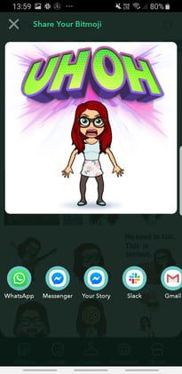 A partir de ahí, tienes un montón de opciones para personalizar tus stickers y cómics de Bitmoji. Puedes vestirlos con varios trajes, ponerlos en distintas situaciones, crear innumerables pegatinas con diferentes posturas y expresiones y así sucesivamente (también puedes cambiar el estilo general). Luego, cuando estés listo, elige uno y pégalo en la aplicación de redes sociales que prefieras para darle un toque personal a la conversación.