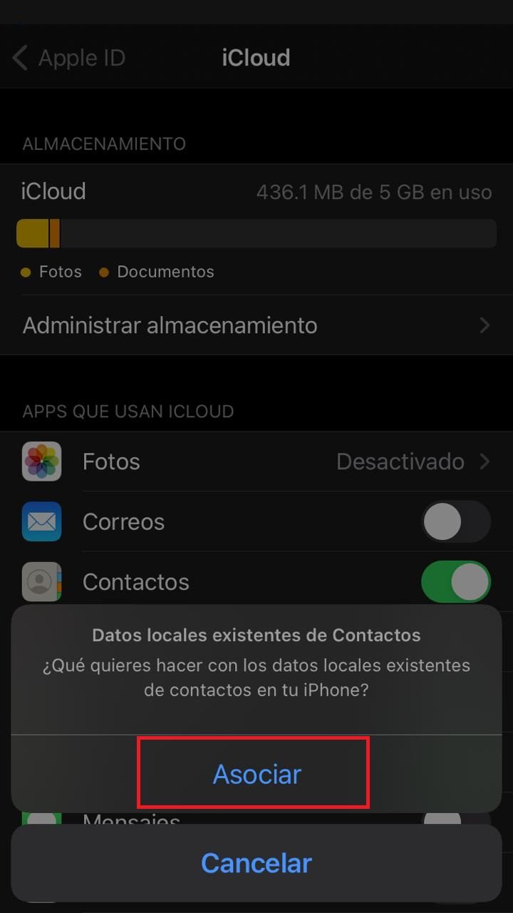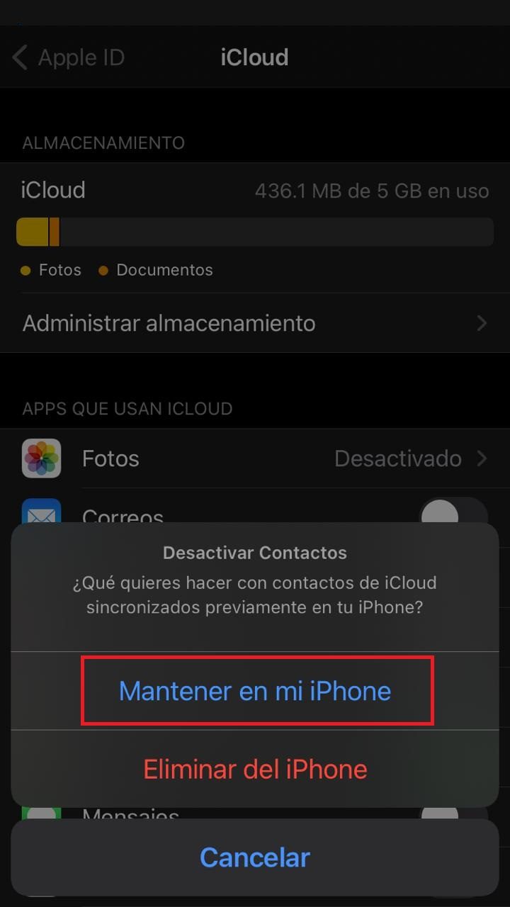 Paso 2: desactiva Contactos y selecciona Mantener en mi iPhone.