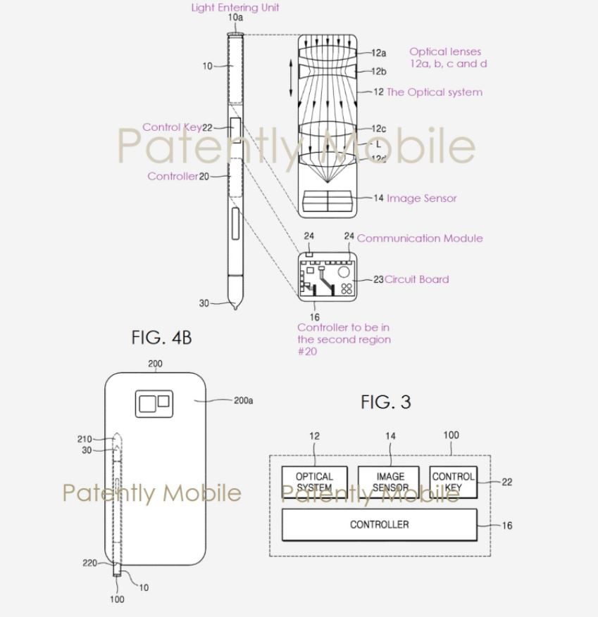 El posible plan de Samsung se ha revelado en una patente que fue otorgada por la Oficina de Patentes y Marcas Registradas de los Estados Unidos (USPTO por sus siglas en inglés), que muestra un lente de cámara integrada en la parte superior de un S Pen, que incluso tiene un zoom óptico. Los zooms ópticos son raros en los teléfonos inteligentes, principalmente debido a las restricciones de espacio y tamaño internos; pero al usar un sistema de “estilo periscopio”, podría ser posible crear un zoom lo suficientemente pequeño como para caber dentro de un lápiz digital.