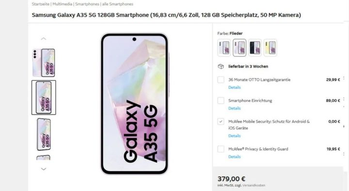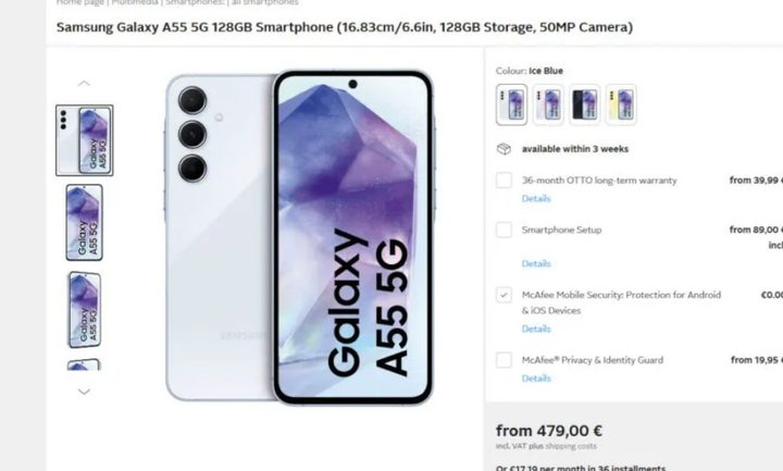 La cadena minorista alemana Otto (tal como reportó el periodista de WinFuture Roland Quandt) ha publicado listados de productos para el Galaxy A35 y el Galaxy A55. Empezando por el dispositivo más barato, el A35 tiene un precio de 379 euros (~413 dólares) para el modelo base de 6GB/128GB. Espera pagar 449 euros (~489 dólares) por la variante de 8GB/256GB.