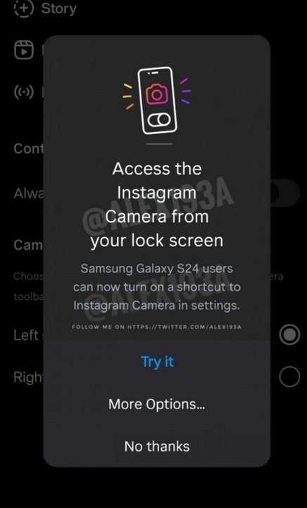 La novedad: el Galaxy S24 puede venir con un acceso directo adicional para la cámara de Instagram en la pantalla de bloqueo. La función fue revelada por Alessandro Paluzzi, un usuario de la red social X, donde revelaron una captura de pantalla.