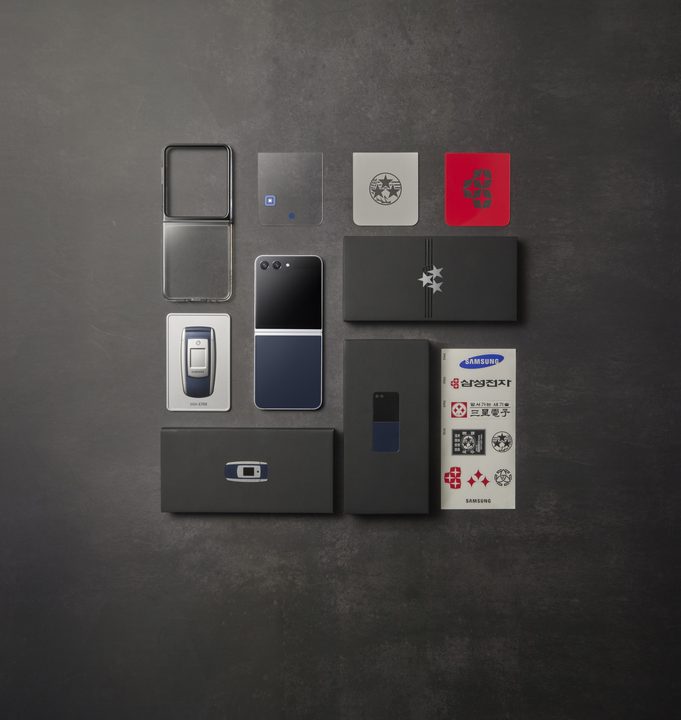 Como parte de la caja, obtendrá el teléfono de edición Retro, una funda Flipsuit, tres tarjetas Flipsuit con logotipos de Samsung de diferentes épocas de la historia de Samsung y una tarjeta de coleccionista grabada con un número de serie único.