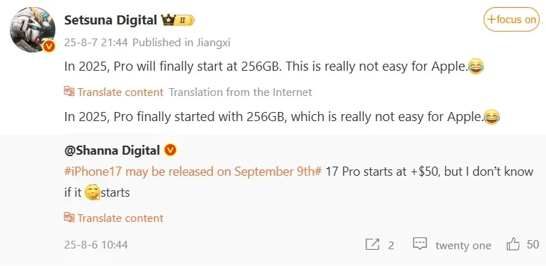 El filtrador Instant Digital compartió en Weibo que el próximo iPhone 17 Pro comenzará en 256 GB, finalmente abandonando la opción de 128 GB para la línea insignia de primer nivel de Apple.