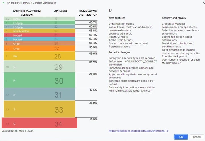 Cerca del 70 por ciento de los dispositivos iOS están ejecutando la última versión. Esa cifra es mucho más baja para Android. Android 13 es el rey aún, seguido de Android 14. Así es como Android se divide, según el sitio web oficial de Android Developer:
