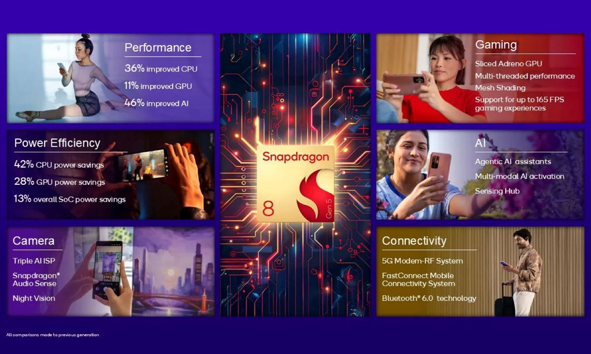 El módem X80 de la Gen 5 normal tiene velocidades máximas 5G ligeramente más bajas que la versión Elite, aunque el rendimiento de Bluetooth y Wi-Fi debería ser el mismo, y se admiten tanto satélite como ultra banda ancha (UWB). También tiene especificaciones ligeramente rebajadas en su GPU Adreno y en el NPU Hexagon AI, aunque Qualcomm ha dado menos detalles en las comparaciones exactas y no puede usar el último almacenamiento UFS 4.1. Pero otras especificaciones son idénticas en ambos chipsets, incluyendo capacidades de carga, soporte para pantalla y la gran mayoría de las opciones de hardware de la cámara.