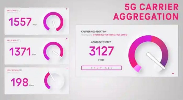 Para esta prueba específica, T-Mobile utilizó dos canales de su red 5G ultra de capacidad ultra de 2,5 GHz y un canal de espectro de 1900 MHz (1,9 GHz) que normalmente está ocupado por servicios 4G /LTE más antiguos. Esto proporcionó un espectro 5G efectivo de 210MHz en los tres canales.