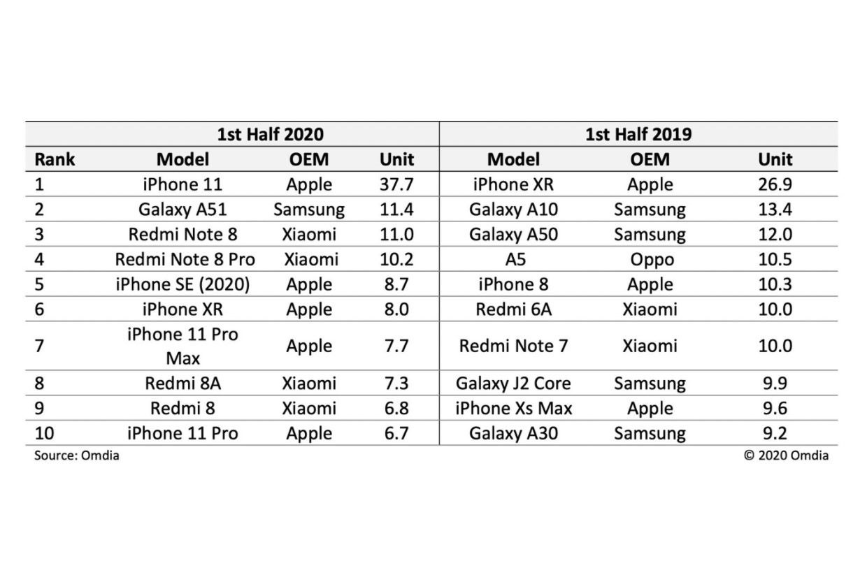 “Los resultados del primer semestre de 2020 están en marcado contraste con los del año pasado, en los que cuatro de los teléfonos de Samsung estaban presentes, mientras que solo dos modelos de iPhone se abrieron paso entre los 10 primeros”, analizó el medio.