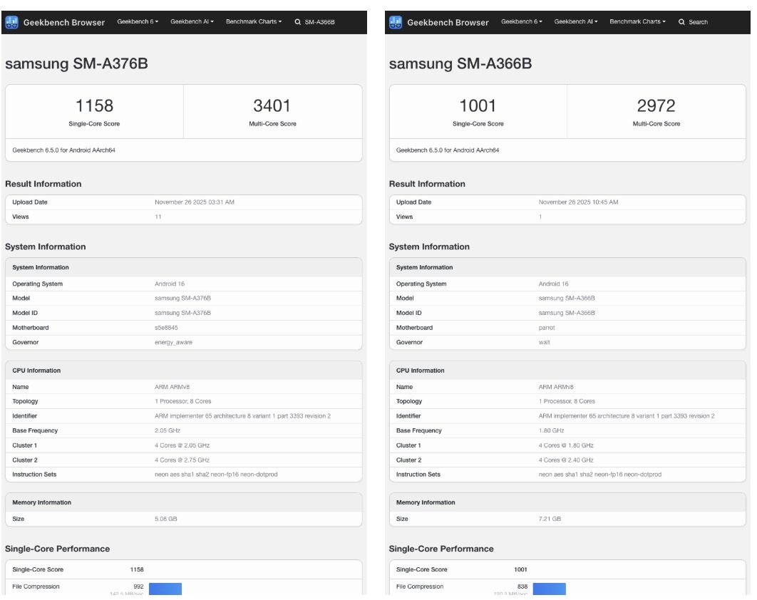 El próximo Galaxy A37 de Samsung ha sido descubierto en Geekbench (a través de Mohammed Khatri). Según la ficha, tiene el procesador Exynos 1480, a diferencia del Snapdragon 6 Gen 3 que está en su predecesor, el Galaxy A36.