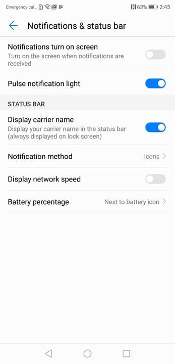 La muesca en el Huawei P20 y P20 Pro crea una barra de notificaciones bastante saturada en la parte superior de la pantalla. Afortunadamente, es bastante fácil ganar un poco más de espacio al ocultar el nombre del operador en la barra de notificaciones. Para hacerlo dirígete a Configuración> Aplicaciones y notificaciones> Notificaciones y barra de estado y desactiva Mostrar nombre del operador.