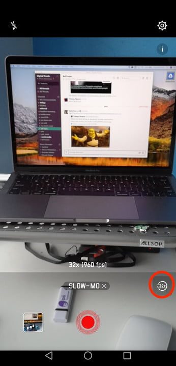 Abre la aplicación Cámara y desliza el control deslizante sobre el botón del obturador hacia la izquierda, hasta que veas la opción Más. Toca Slow-mo y selecciona 32x de velocidad desde el ícono a la derecha del botón del obturador. Presiona el botón del obturador cuando estés listo para filmar. Tendrás dos segundos para tomar tus imágenes en cámara lenta.