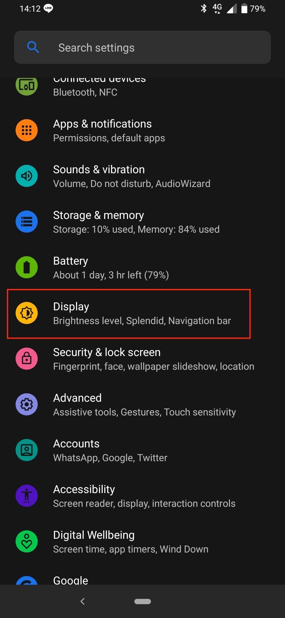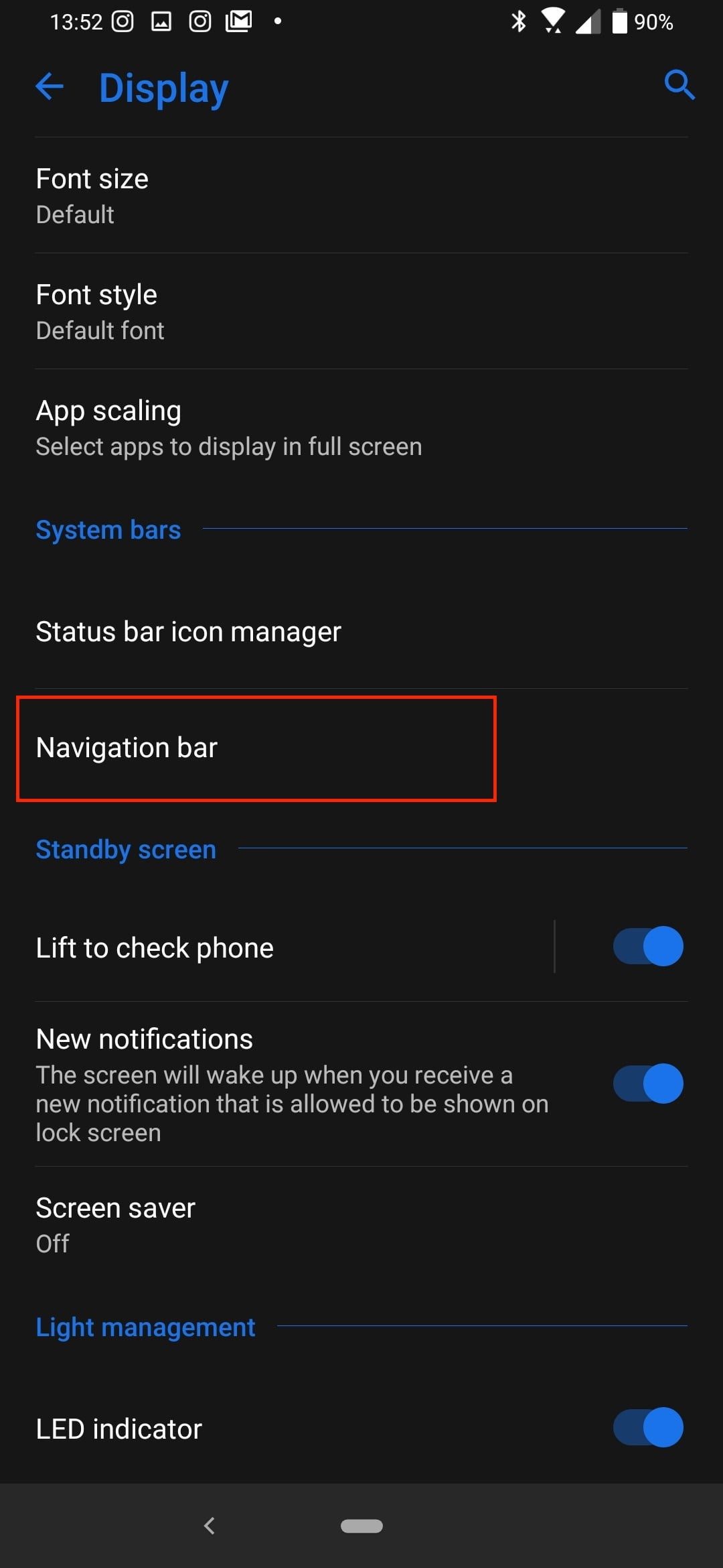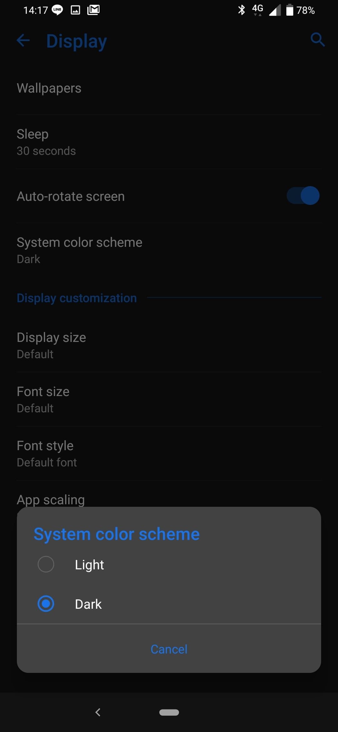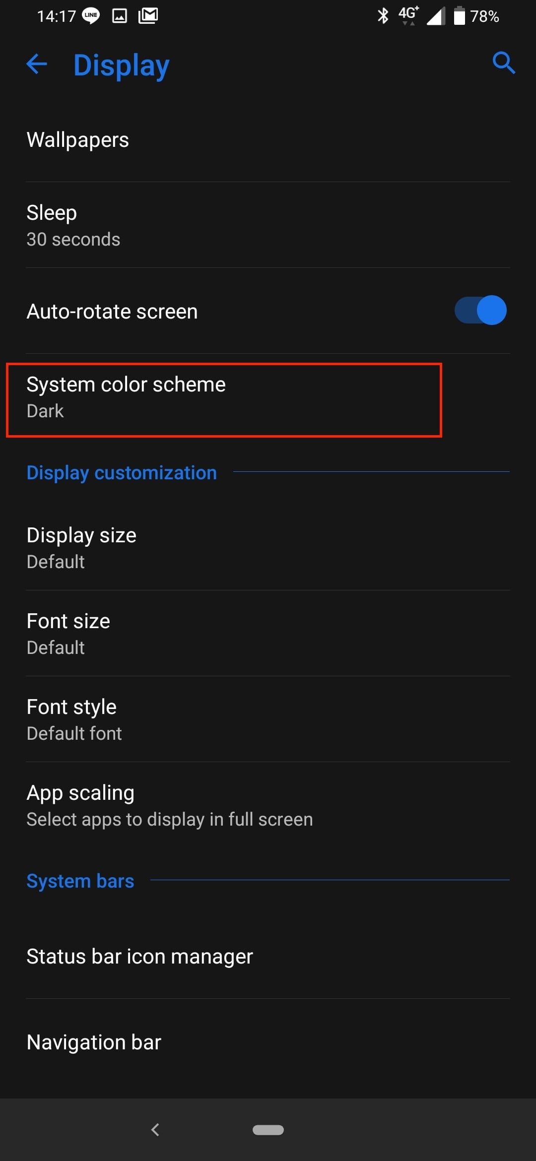 Abre Configuración>Pantalla y, a continuación, busca Esquema de colores del sistema. Toca esta opción y selecciona Oscuro entre las dos opciones.