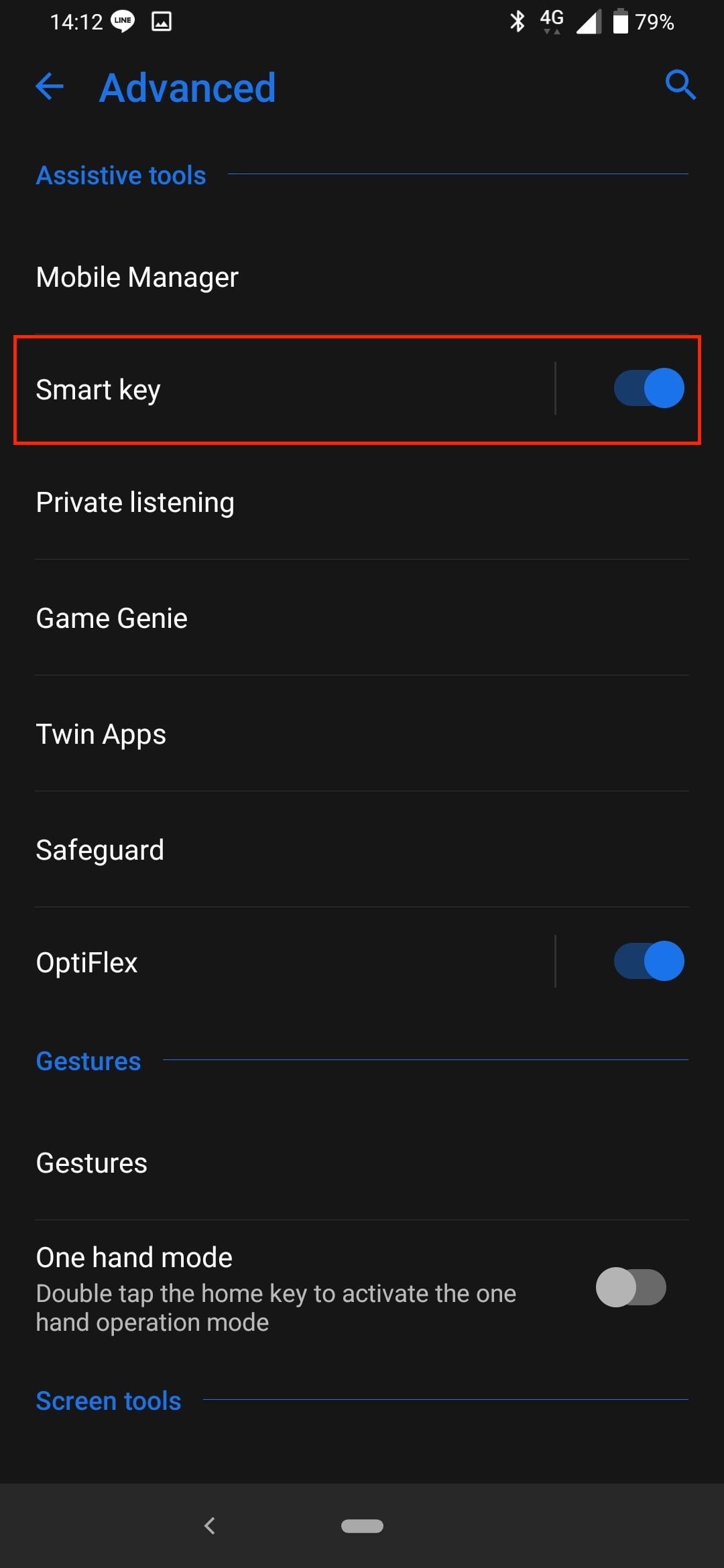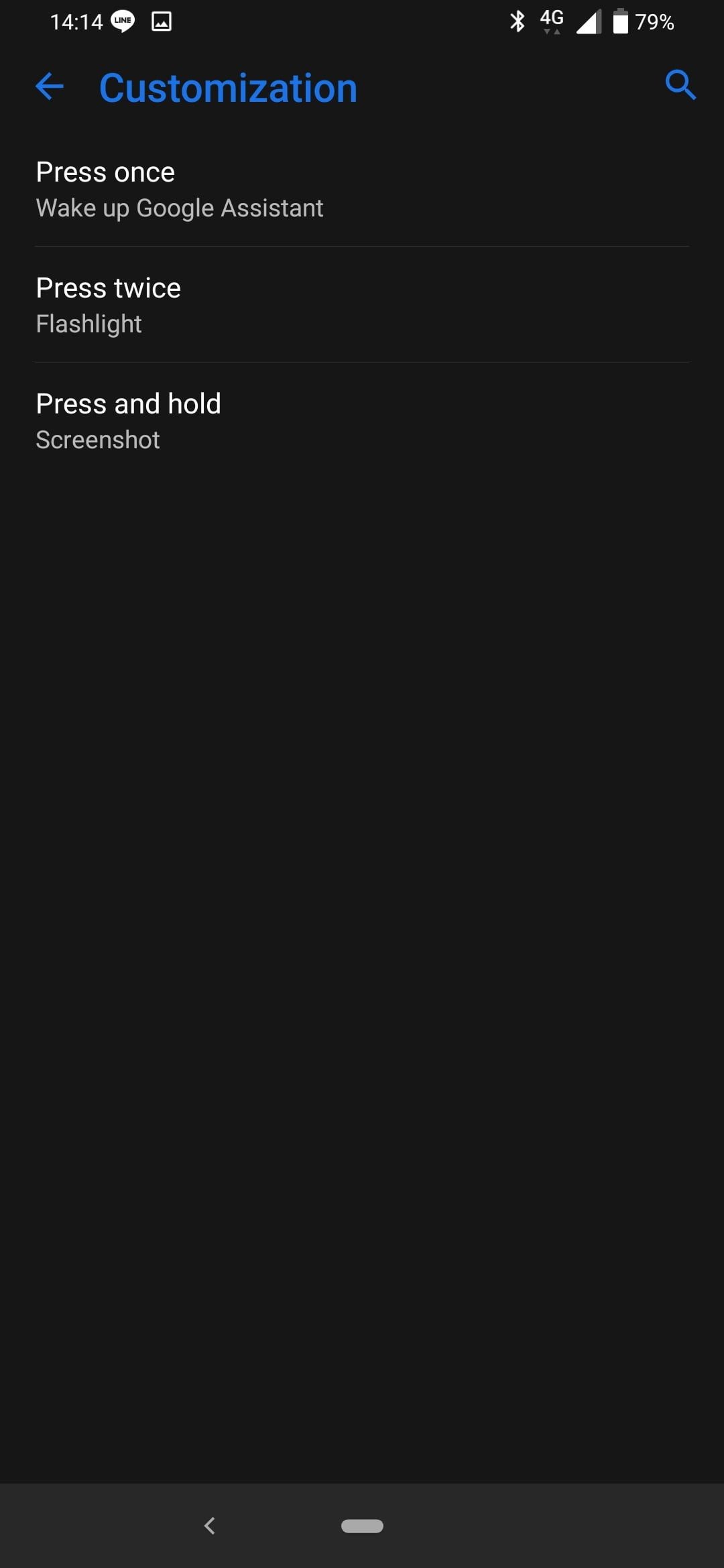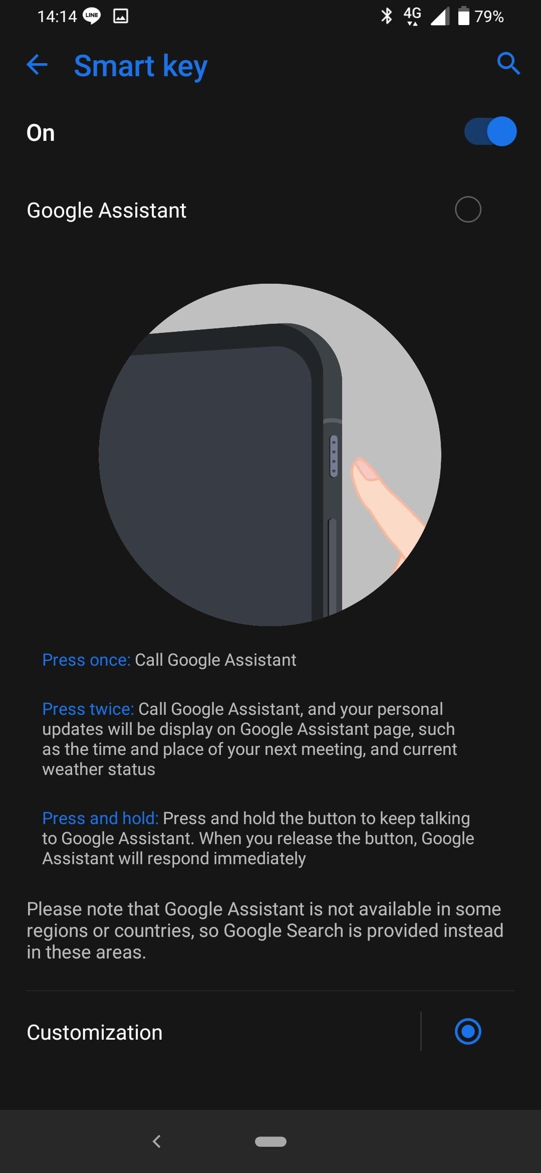 Abre Configuración>Avanzado>Tecla inteligente y, a continuación, Personalización. Vuelve a tocar Personalización y te aparecen varias opciones para asignar una nueva función a las tres pulsaciones de la tecla inteligente.
