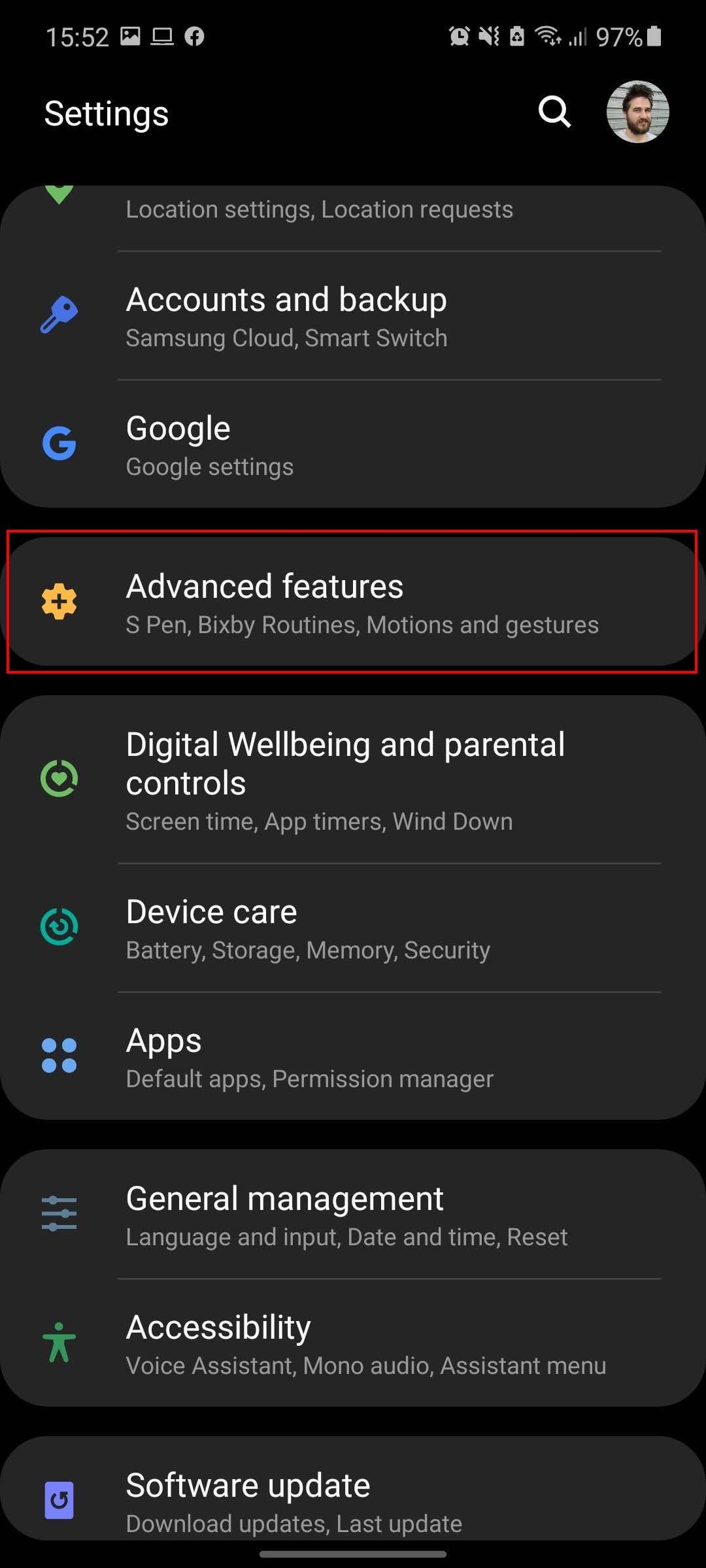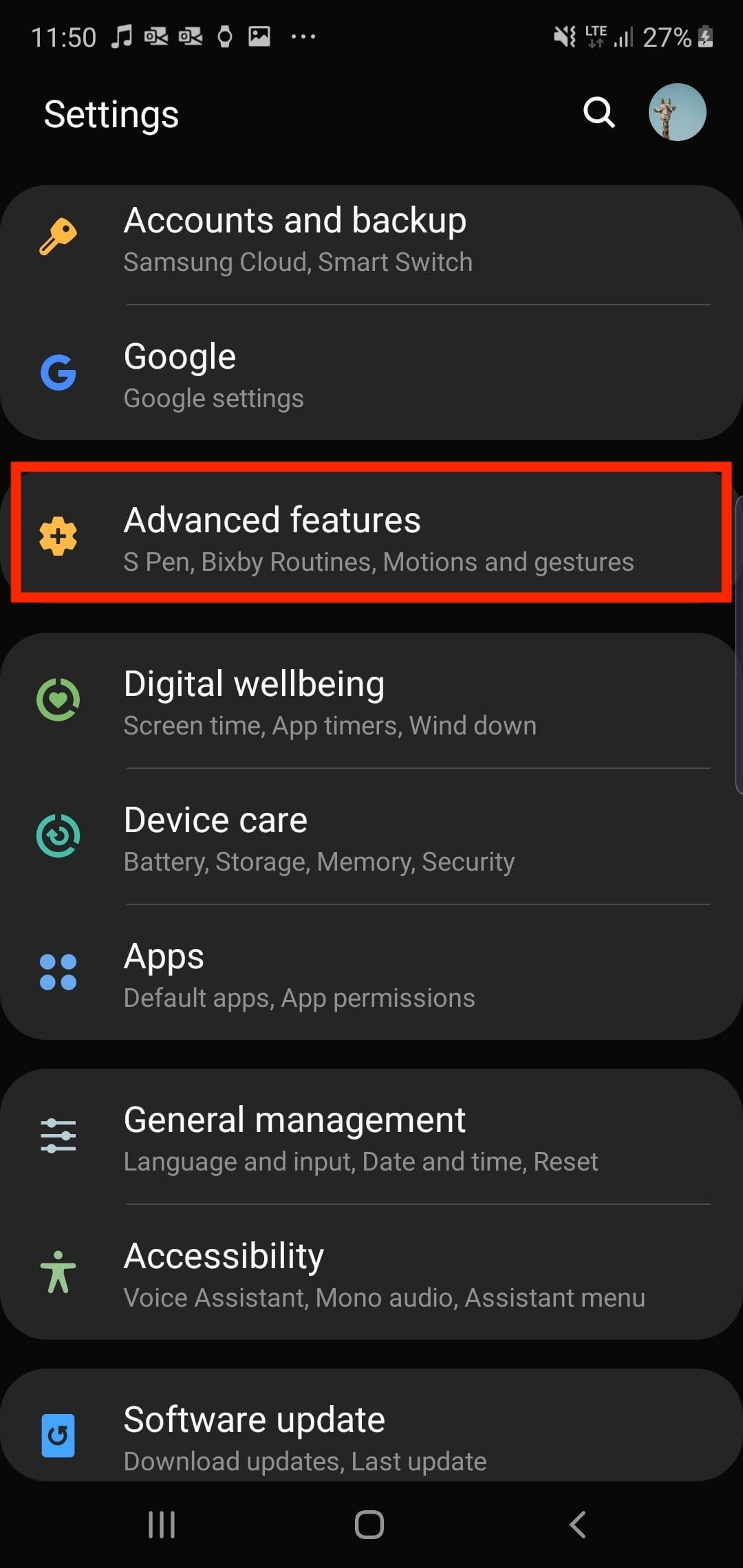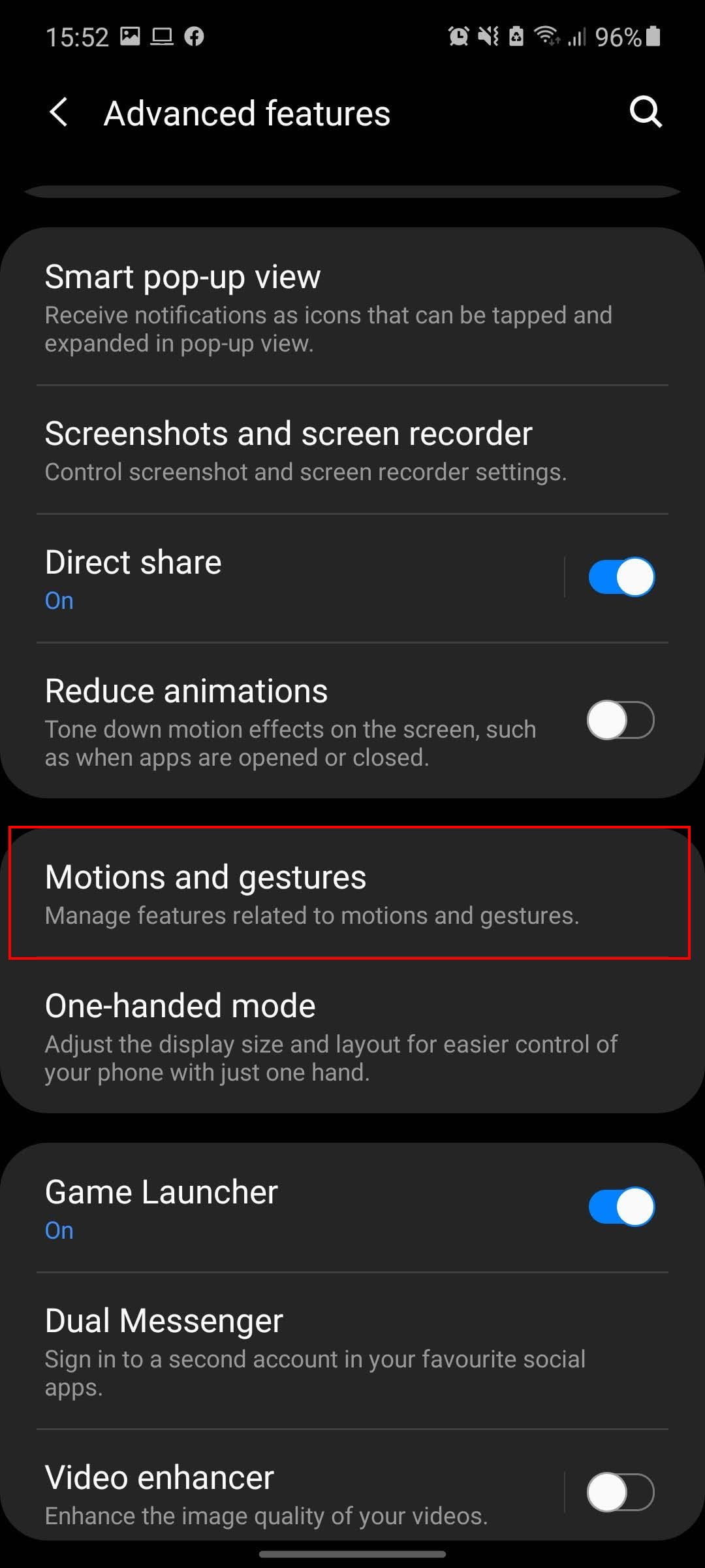 Puedes encontrar la primera configuración en Ajustes>Funciones avanzadas>Movimientos y gestos>Deslizar la palma de la mano para capturar, mientras que se puede acceder a la segunda simplemente sacando el lápiz S Pen y seleccionando Selección inteligente en el menú Comandos aéreos.