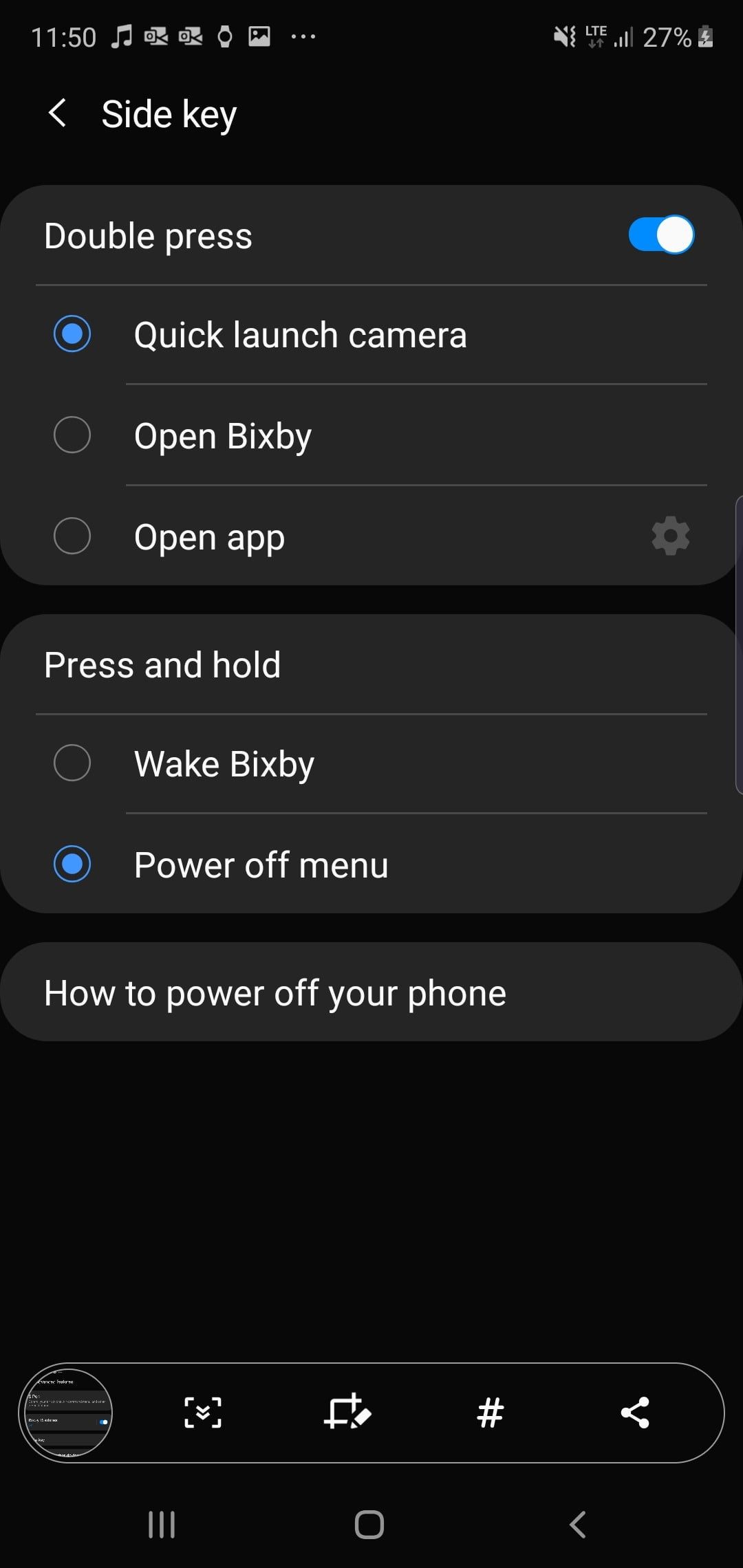 El botón de encendido del Note 10, por defecto, está configurado para despertar la pantalla con un clic, activar Bixby con una pulsación larga y abrir la cámara con una pulsación doble. Esto hace que tengas que apagar el teléfono a través de un botón de software en la pantalla de notificaciones. Afortunadamente, puedes eliminar a Bixby de esta ecuación y hacer que el botón de encendido abra el menú de apagado con una pulsación larga. Esto se puede cambiar en Ajustes>Funciones avanzadas>Tecla lateral. En el mismo menú, puedes elegir cambiar la acción de doble pulsación de acceso directo a la cámara a uno para Bixby o cualquier otra aplicación instalada.