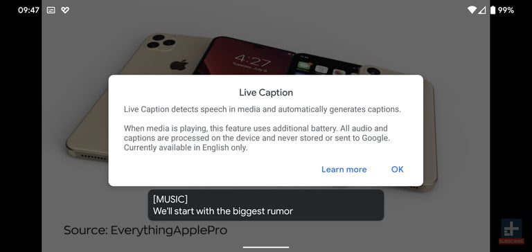 Si es la primera vez que usas Live Captions, verás un mensaje que señala: “Live Caption detecta voz en contenidos multimedia y genera subtítulos automáticamente. Cuando se reproduce un contenido multimedia, esta función utiliza batería adicional. Todo el audio y los subtítulos son procesados en el dispositivo y nunca son almacenados o enviados a Google. Actualmente disponible solo en inglés”.