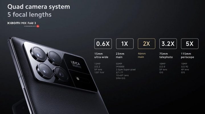 Pasando a las cámaras, Xiaomi equipó Mix Fold 3 con un sistema de cámara cuádruple con óptica Leica. Hay una cámara principal Sony IMX50 de 800MP (equivalente a 23 mm) con OIS, así como un módulo ultra ancho de 12MP (equivalente a 15 mm). Las tomas con zoom se manejan mediante un teleobjetivo de 10MP (75 mm) con zoom de 3x y un módulo de periscopio de 10MP (115 mm) que ofrece un zoom óptico de hasta 5x. Ambos módulos de teleobjetivo cuentan con OIS.
