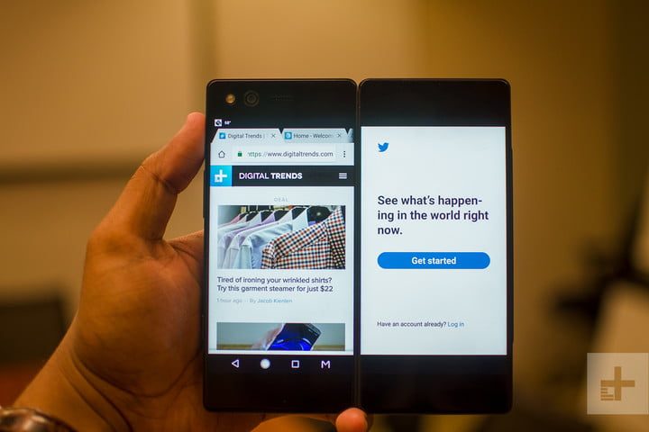 La gran innovación es que tiene dos pantallas, una en la parte delantera y otra en la parte posterior. Tendrás la posibilidad de desplegar la pantalla trasera para tener dos pantallas LCD de 5.2 pulgadas pegadas una junto a la otra, lo que hace que sientas que estás sosteniendo una tableta en miniatura. Ambas tienen una resolución de 1,920 × 1,080 píxeles, y la pantalla está protegida con Corning’s Gorilla Glass 5. Si te da miedo dejar caer el celular, tenemos malas noticias ya que realmente no hay cómo ponerle un estuche para proteger el dispositivo de caídas y golpes.