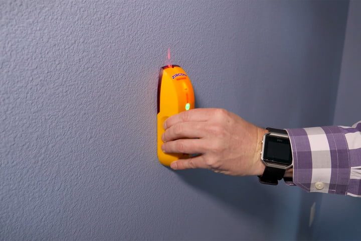 - Ve despacio: para ser efectivo, los buscadores deben estar calibrados correctamente. Primero, coloca el tuyo en la pared y enciéndelo, generalmente puedes hacer esto manteniendo presionado un botón. Deja que el buscador lea la densidad del material (esto solo tomará uno o dos segundos), y luego muévelo lentamente de un lado a otro. Avanza y retrocede varias veces sobre la pared, comenzando desde un punto diferente en cada momento. Marca cada travesaño que descubras con cinta de pintor. Te recomendamos encontrar tres y usar una cinta métrica para asegurarse de que estén a la misma distancia. Esto te ayudará a evitar “falsos positivos”.