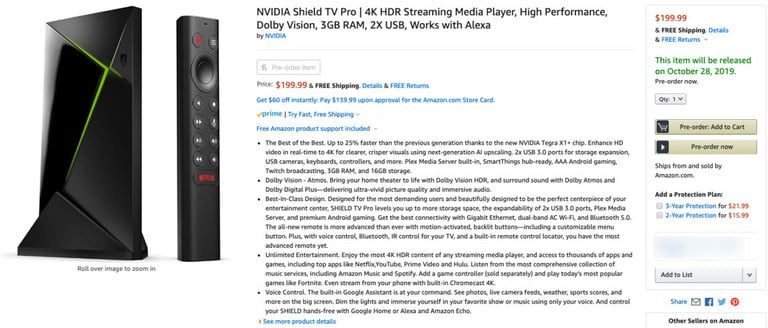 El sitio web de compras publicó una página de producto del Nvidia Shield TV Pro el 17 de octubre, algo que fue descubierto por varias publicaciones, entre ellas Android Authority, que realizó una captura de pantalla con sus características técnicas.