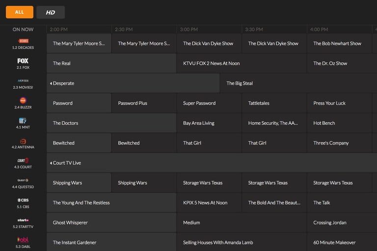 Cuando te registras en el servicio, aparecerá una guía de TV con los canales transmitidos disponibles en tu mercado específico. Si tocas un programa que está al aire, aparecerá una breve descripción y la opción de empezar a verlo. No hay capacidad de DVR para grabar y no hay programas on demand, solo televisión en vivo.