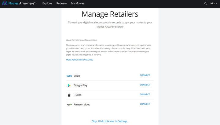 Movies Anywhere no solo es la primera colaboración de este tipo en combinar múltiples estudio, sino que también se trata de una asociación importante entre minoristas digitales, incluyendo Apple (iTunes), Google Play, Vudu, Amazon Video, FandangoNow y Microsoft. Una vez que te hayas registrado, todas las películas compradas en uno de estos minoristas aparecerán en tu biblioteca a través del sitio web y las aplicaciones de Movies Anywhere, y al mismo tiempo, estas películas también deberían aparecer en las bibliotecas de todos estos minoristas.