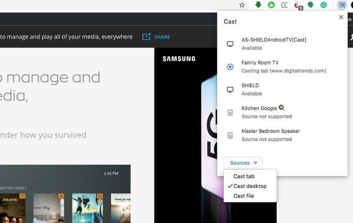Para enviar todo el escritorio de tu computadora al televisor, simplemente haz clic en el menú de tres puntos, selecciona Transmitir…, elija tu dispositivo y luego Escritorio de la lista desplegable de fuentes. Esta opción requiere un alto nivel de potencia de procesamiento de tu computadora y puede ralentizar la reproducción de video, disminuir la calidad de video y funcionar más lentamente si tu PC o Mac no es muy potente (también reducirá la batería de la portátil si no está enchufada).