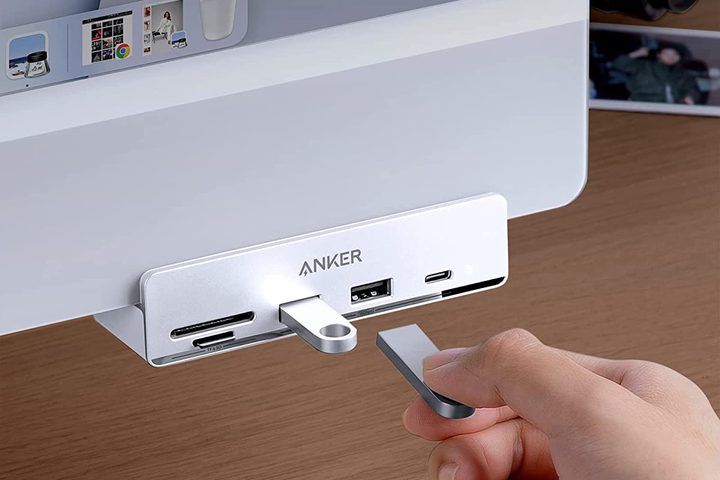 Diseñado especialmente para algunos modelos de iMac, lo que incluye la de 2021 con el procesador M1, este hub requiere uno de los puertos USB-C, pero a cambio regresa cinco más, como dos USB-A de 10 Gbps y lector de tarjetas. Su diseño hace que las conexiones sean fáciles de alcanzar. Y es que Apple, con tal de tener una propuesta “limpia” al frente, coloca las entradas en la parte posterior de sus iMac.
