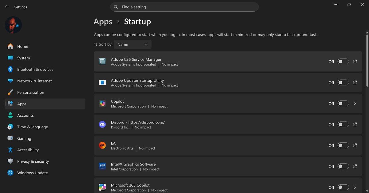 Una de las formas más fáciles de liberar memoria es reducir lo que se inicia una vez que inicia Windows. Dirígete a Configuración > Aplicaciones > Inicio y desactiva todo lo que no necesites ejecutar inmediatamente. Muchas aplicaciones, como los clientes de chat y las utilidades de actualización, acaparan silenciosamente la RAM en segundo plano. También puede abrir el Administrador de tareas (Ctrl + Mayús + Esc), cambiar a la pestaña Aplicaciones de inicio y desactivar los procesos de alto impacto. Te sorprenderá lo fluido que se siente tu sistema una vez que esas aplicaciones en segundo plano dejan de mordisquear tu RAM.