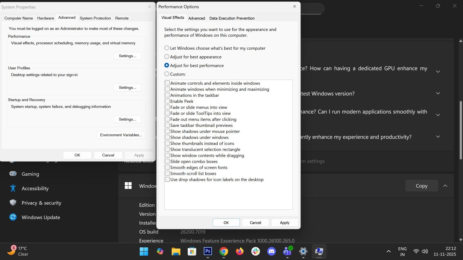 Puede que no sea tan bonito, pero deshabilitar los efectos visuales innecesarios puede darle a su PC un impulso notable. Siga el mismo camino que se mencionó anteriormente y abra Configuración avanzada del sistema. En la pestaña Avanzado, haga clic en el botón Configuración y seleccione la opción Ajustar para obtener el mejor rendimiento. Esto desactiva las animaciones, la transparencia y las sombras que consumen ciclos de CPU y RAM.