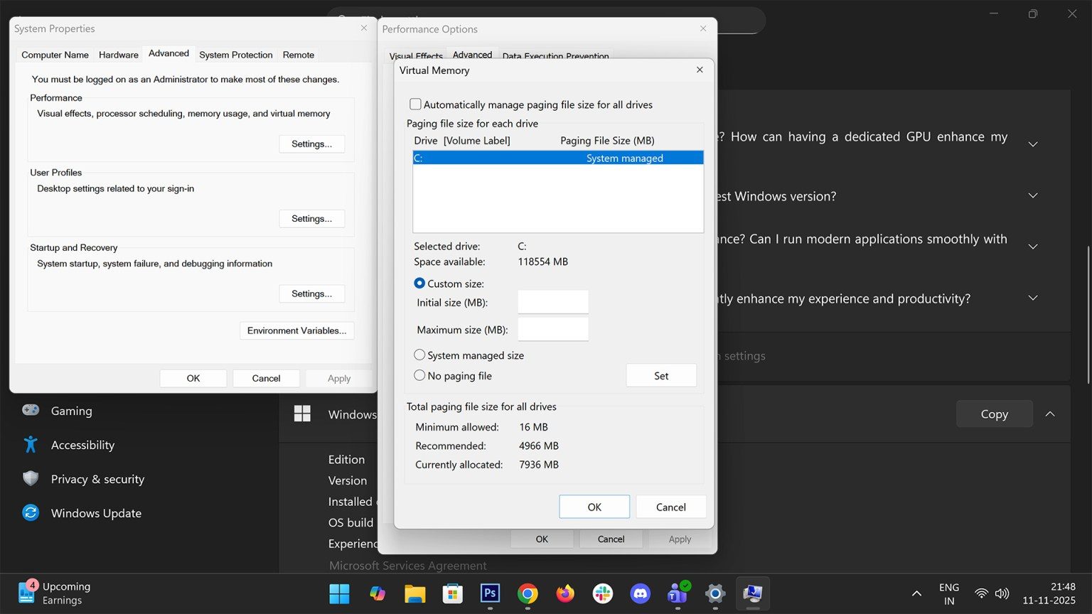 Windows 11 usa automáticamente una parte de su unidad de almacenamiento como memoria virtual, pero ajustarla manualmente a menudo puede ayudar. Vaya a Configuración > Sistema > Acerca de > Configuración avanzada del sistema para abrir un nuevo cuadro de diálogo y diríjase a la pestaña Avanzado. En la sección Rendimiento, haga clic en el botón Configuración, donde encontrará la opción de ajustar la memoria virtual en Avanzado, donde puede establecer un tamaño personalizado, generalmente de 1.5 a 2 veces su RAM instalada. Si tiene un SSD, el archivo de intercambio actuará más rápido, lo que le dará a su sistema más espacio para respirar al realizar múltiples tareas o editar archivos grandes.