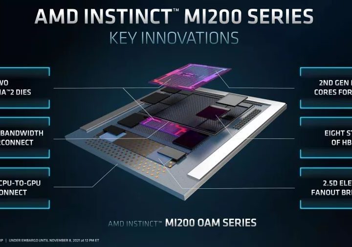 Tres serán las tarjetas dentro de la línea Instinct MI200: MI250X, MI250 y MI210. La primera será la más potente, con 2 x 110 core units, un máximo de 47.9 teraflops de cómputo, 128 GB de memoria a una velocidad de transferencia de 3.2 Gbps y un bus de datos de 8192 bits.