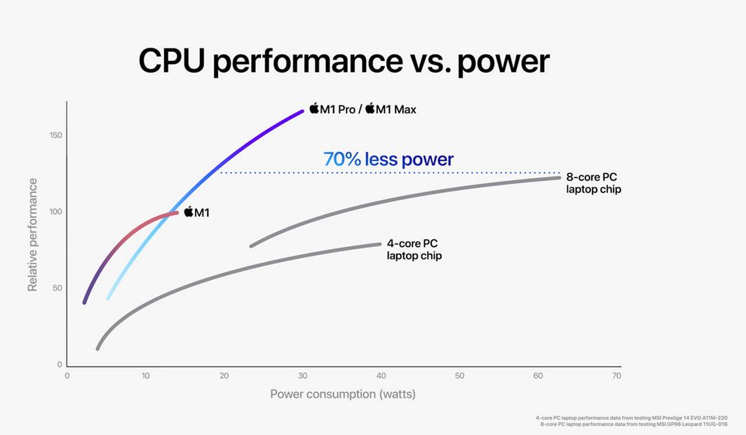 Más que comparar estos nuevos chips con el M1 original, Apple pone énfasis en su rendimiento frente a procesadores más tradicionales para equipos portátiles. Según la compañía, tanto el M1 Pro como el M1 Max son capaces de superar —o al menos estar a la par— de los chips para portátiles más potentes basados en la arquitectura x86 que producen AMD o Intel.