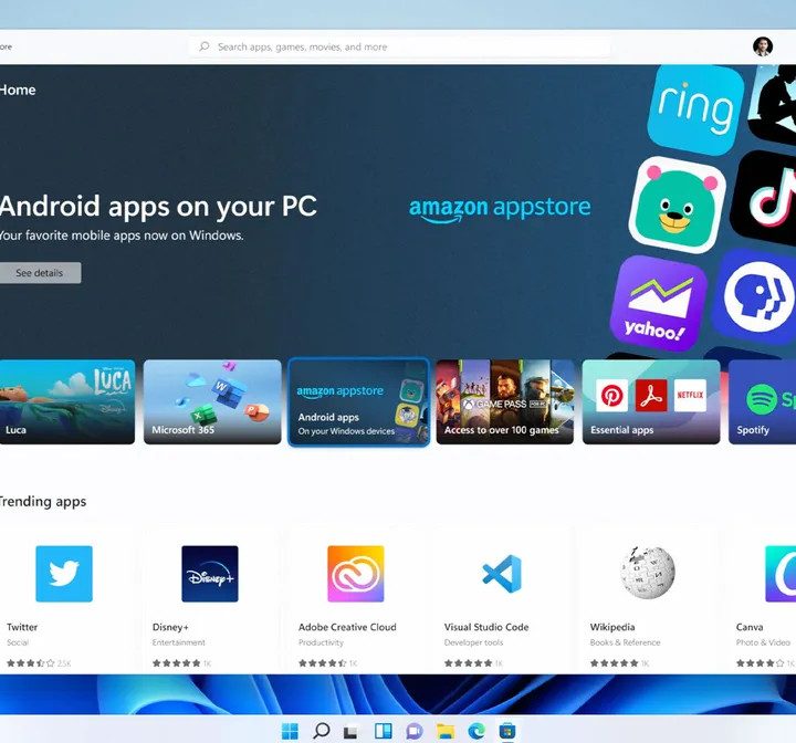 La tienda de Windows que Microsoft mostró incluyó, entre otras apps, a Ring, Yahoo y Uber, por mencionar algunos. Lo que aún no está claro es cuántos dispositivos existentes admitirán aplicaciones de Android con Windows 11.