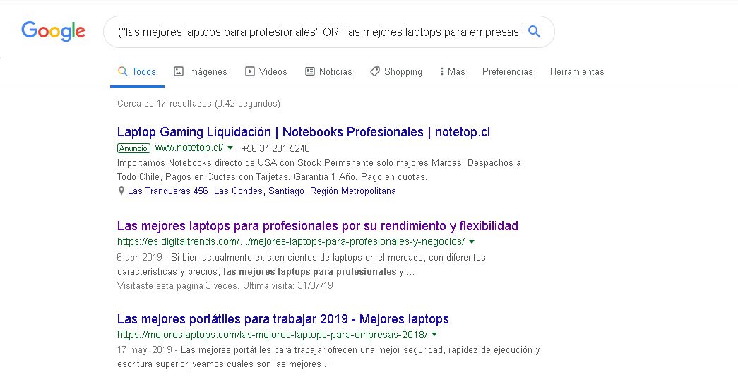 - (“las mejores laptops” hdr) OR (“las mejores tabletas” Android): entregará los resultados de páginas con la frase “las mejores laptops” y la palabra “hdr”, pero también las que tengan la frase “las mejores tabletas” y la palabra “Android”.