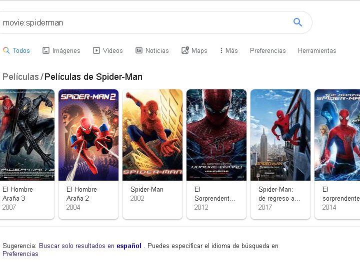 - movie: muestra los resultados asociados a películas. Esto puede ser útil si solo recuerdas una parte del nombre de la cinta. Si ingresas movie:spiderman, obtendrás todas las películas sobre este superhéroe, incluyendo la más reciente Spider-Man: Far From Home.