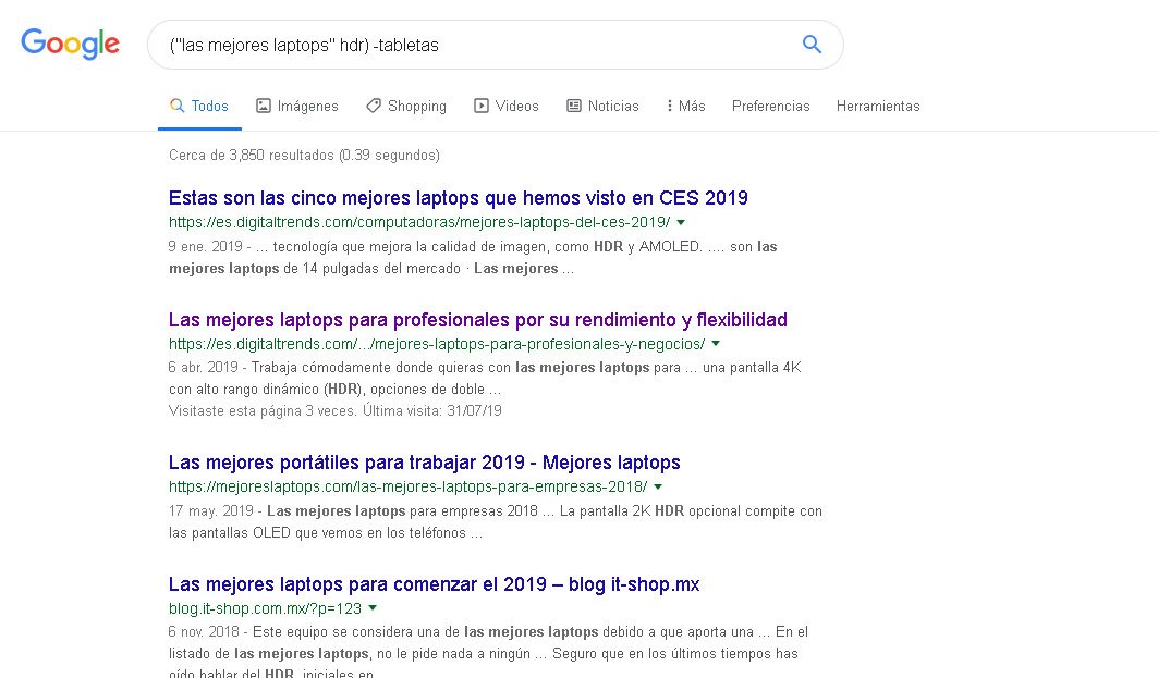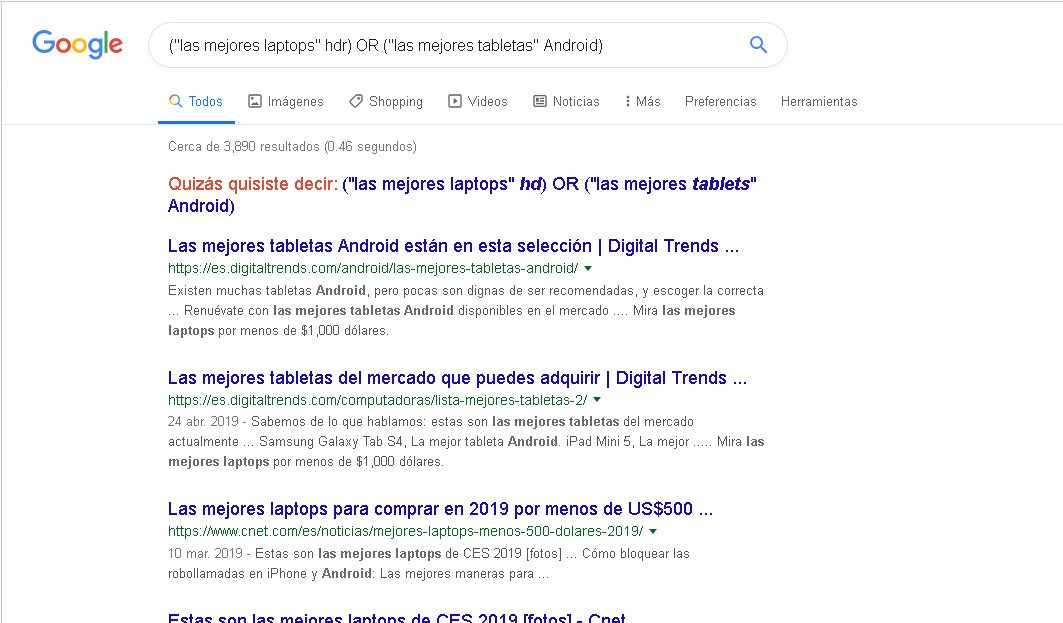 - (“las mejores laptops” hdr) OR (“las mejores tabletas” Android): entregará los resultados de páginas con la frase “las mejores laptops” y la palabra “hdr”, pero también las que tengan la frase “las mejores tabletas” y la palabra “Android”.
