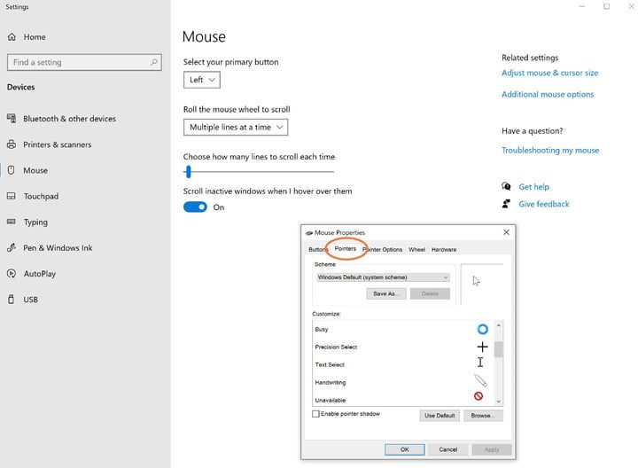 Cuando hayas encontrado uno que se vea bien, haz clic en Aplicar para implementar los cambios. Vuelve al menú Propiedades del mouse para cualquier cambio adicional en el futuro. La opción Habilitar sombra de puntero añade una sombra estética al puntero; es interesante, pero no muy útil.