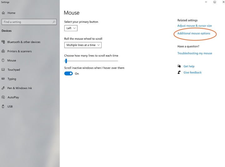 Haz clic o presiona el icono de Windows, luego escribe “mouse“. Haz clic en Cambiar la configuración del mouse en la lista de opciones que te aparece al abrir el menú de configuración principal del mouse (esto también está disponible en la aplicación Configuración principal). A continuación, selecciona Opciones de mouse adicionales.