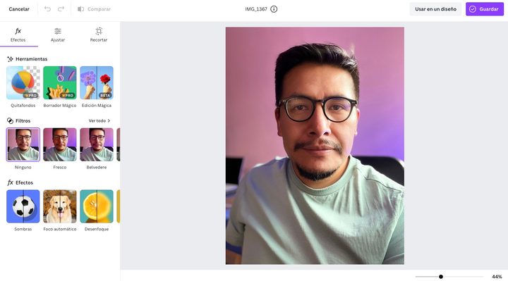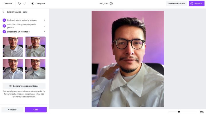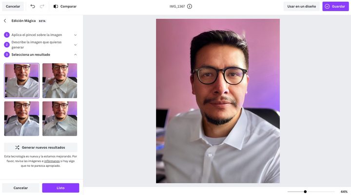 No es imposible encontrar una representación de carácter profesional con Edición Mágica de Canva. Sin embargo, de 20 fotos generadas con su IA, únicamente unas dos nos sirvieron para tal propósito. Ten en cuenta que solo es posible emplear esta herramienta hasta 25 veces por día.