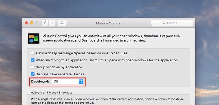 Si estás ejecutando una versión anterior de macOS, puedes deshabilitar el Dashboard. Fue útil y divertido en 2005, pero hoy en día una colección de widgets que ocupan toda la pantalla equivale a un desorden innecesario.