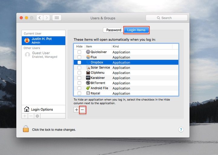 Si ves alguna aplicación que no necesitas que se inicie al momento de encender tu computadora (Spotify, por ejemplo), selecciónela en la lista y haz clic en el botón “menos”, en la parte inferior de la pantalla.