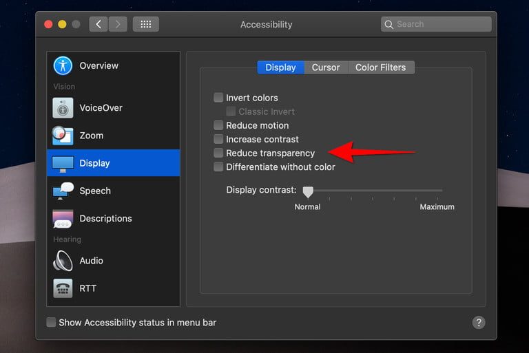 Step 3: haz clico en Pantalla y luego marca la opción Reducir transparencia–